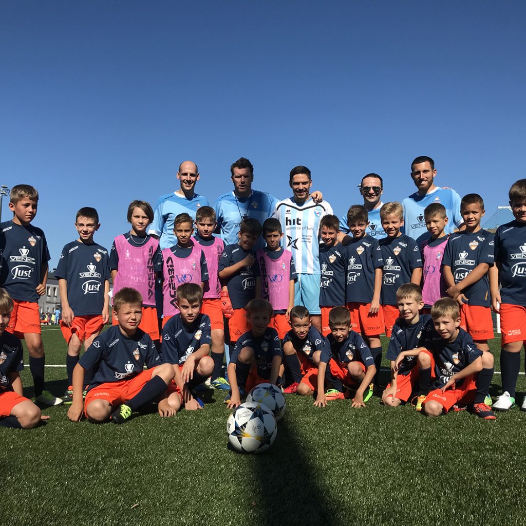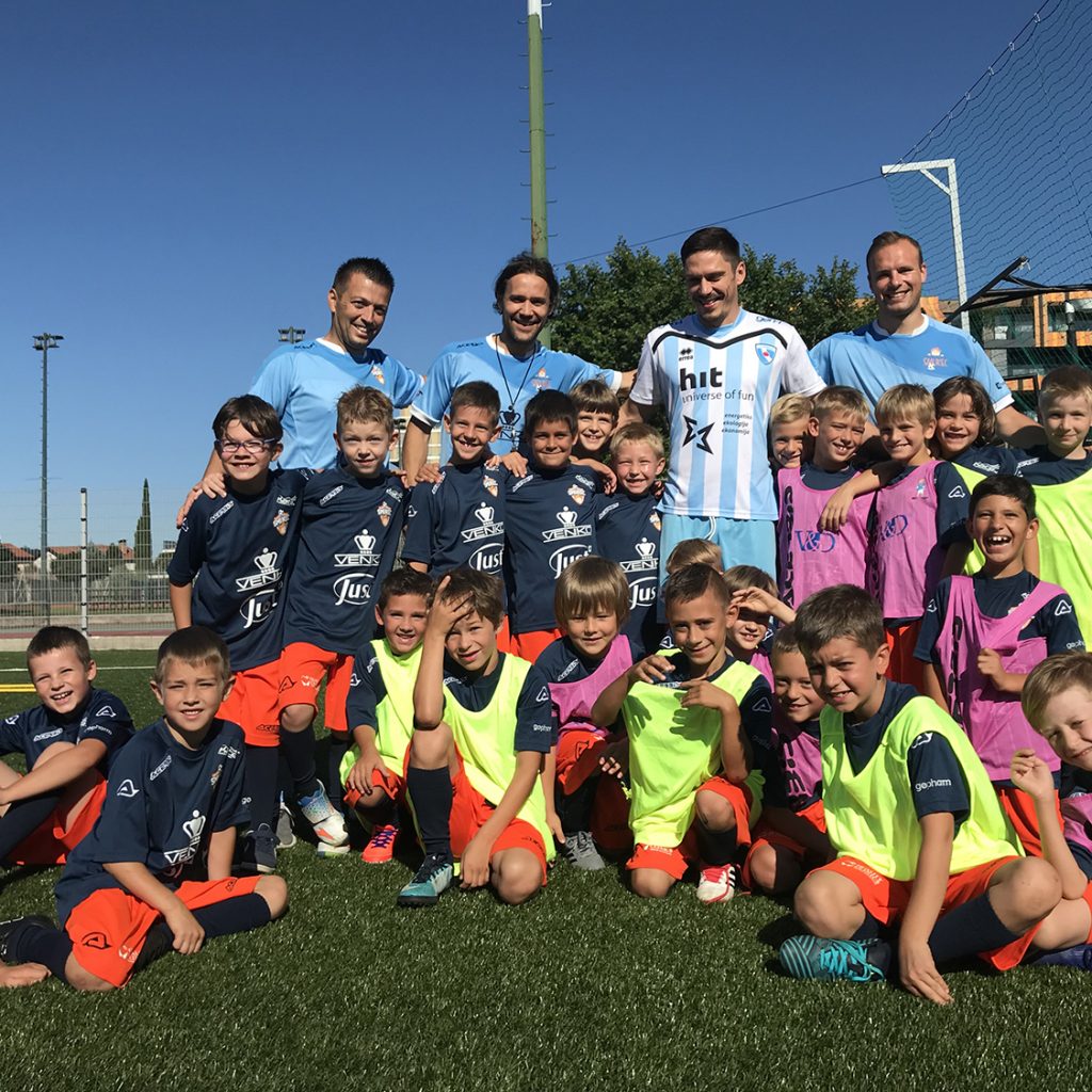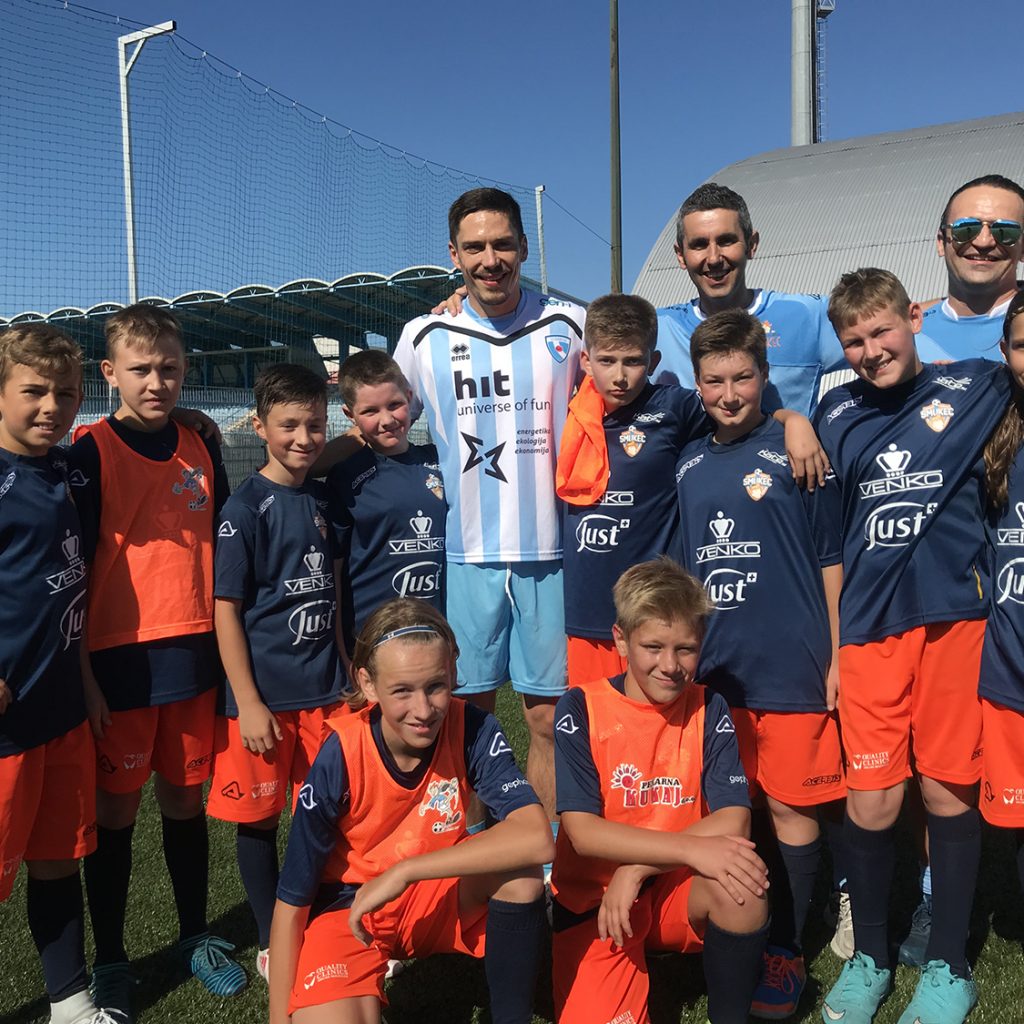 Drugi dan Nogometnega kampa Smukec je bil s soncem obsijan v pravem pomenu besede. Smukci so odgarali trening ter bili deležni obiska renomiranih nogometnih gostov. Takoj po začetku treninga je Smukce namreč presenetil z obiskom letošnji ambasador Miran Burgič. Z vsako skupino je oddelal 15 minut treninga in vsi prisotni smo opazili, da se je v Miranu prebudila otroška razposajenost. Pred treningom smo ga opozorili, da je Smukčeva energija nalezljiva, kar se je izkazalo za resnično. Nato je Miran popeljal vse Smukce do svojih bivših soigralcev na glavni stadion v Športnem parku v Novi Gorici. Trener ND Gorica Miran Srebrnič s strokovnim štabom ter igralci članske ekipe so otroke prijazno sprejeli, nakar je nastala spominska fotografija. Sledil je sadni obrok in sicer posladkali smo se z okusnimi bananami diskonta Polavček Diskont sadja in zelenjave ter razposajeno zaplesali. Video povzetek treninga je na povezavi https://m.facebook.com/story.p hp?story_fbid=1975601729137876 &id=782973808400680 .